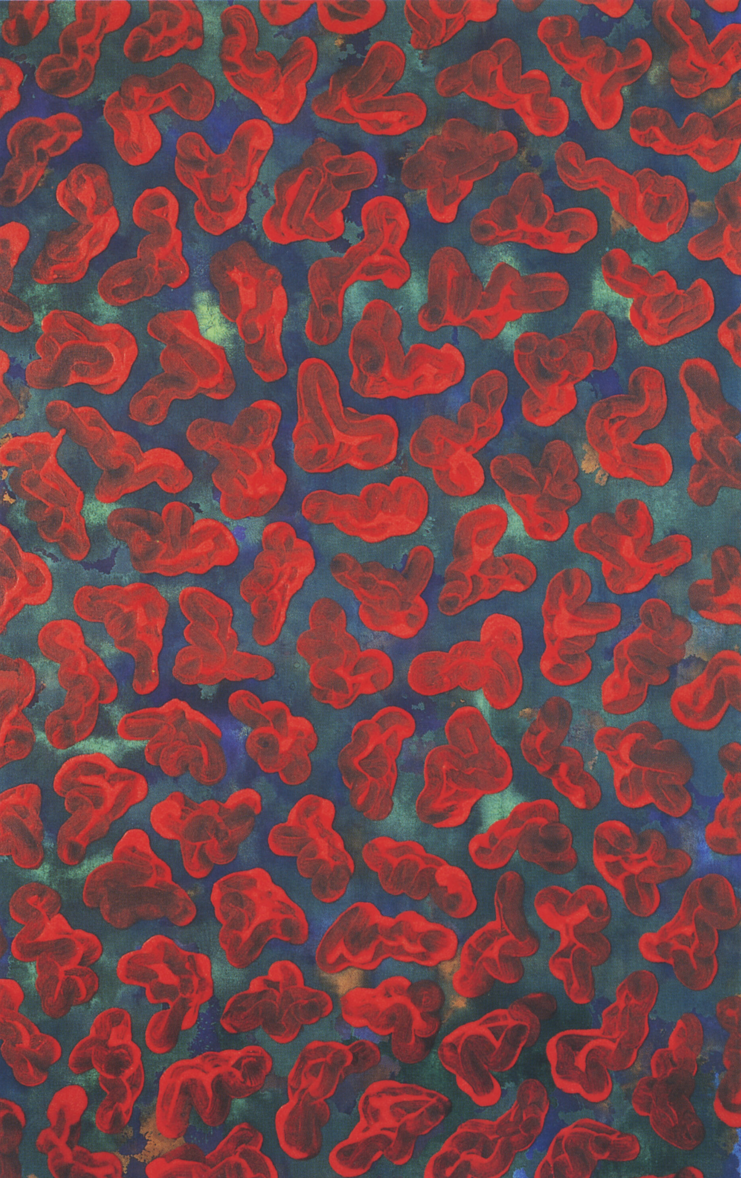 MOVING 1からすぐの翌年、2作目として制作したのがこの作品です。こういう仕事は書き直しができないので書道のような気持ちで一気に書き上げないといけないものです。あらかじめ完成を想定して下地にアクリル絵の具で背景を制作しておいて十分乾燥した状態で、数日後油絵の具で赤い部分を描いています。図と地の関係性は、同等にと考えていましたが、勢い余って図の方がやや優勢になってしまいました。その後、ベルギーの美術館館長ヤン・フート氏が一人で作家と会話しながら審査するコンペティションがあったので出品したところ「いろんな作品を見てきたが、今までこんな絵を見たことがない」と言って何も聞かずに一発合格!初めて自分の作品をそんな風に評価してもらえて驚きました。作品は、夕刻、東京から石川県鶴来市に向かい、私も翌々日、羽田から小松空港に向かいました。同じ飛行機で移動していたヤン・フート氏とも何度も話す機会が生まれ、テレビ番組やニュースの取材もあり素晴らしい経験をさせていただきました。帰りは金沢から京都に向かったのですが、電車中は、当時水戸芸術会館におられた長谷川裕子氏と業界話をお聞きしながらの帰洛となりました。この作品は、その後、福岡に巡回し翌年ギャラリー現で個展をすることになりましたので改めて出品。この時は、初めて美術手帖の展評に神奈川県立近代美術館の橋秀文氏に書いていただき、あらゆる意味でものすごく濃い経験の詰められた自身の記念碑的な作品となりました。(この鶴来町の展覧会には、当時まだ無名だった村上隆氏や、のちにギャラリー現の作家として交流するようになる鈴木貴博氏も選ばれて出品していました。)