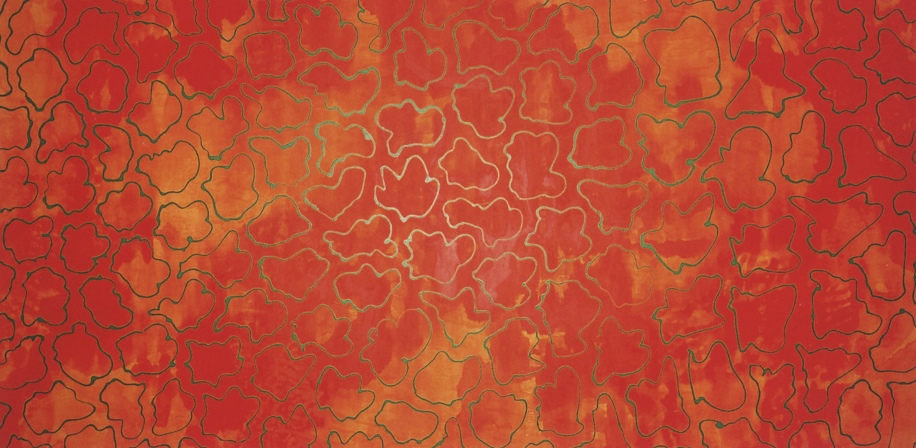 1992年にギャラリー現で2度目の個展を開催することになり、父の京北町の実家で制作したのがこの作品です。比較的広い場所があったのでギャラリーの一番大きな壁をきれいに埋めてみようと目論んで懸命に制作しました。おおらかな空気や風の流れのような浮遊感の中に身を委ね、アメーバなのか、生き物なのか、意味不明な気持ちの良い空白感と何か熱いエネルギーの予感を感じる両面性を持ったペインティングを制作していました。これも一筆書きのように下地を制作し十分乾燥した時間に一気に線描しています。この作品は、その後、石川県の穴水町に運びボイスを考える部屋・穴水展にも出品。そこでは、屋内にこの作品ともう一点の平面を展示。屋外に大型の彫刻作品を現地制作しました。