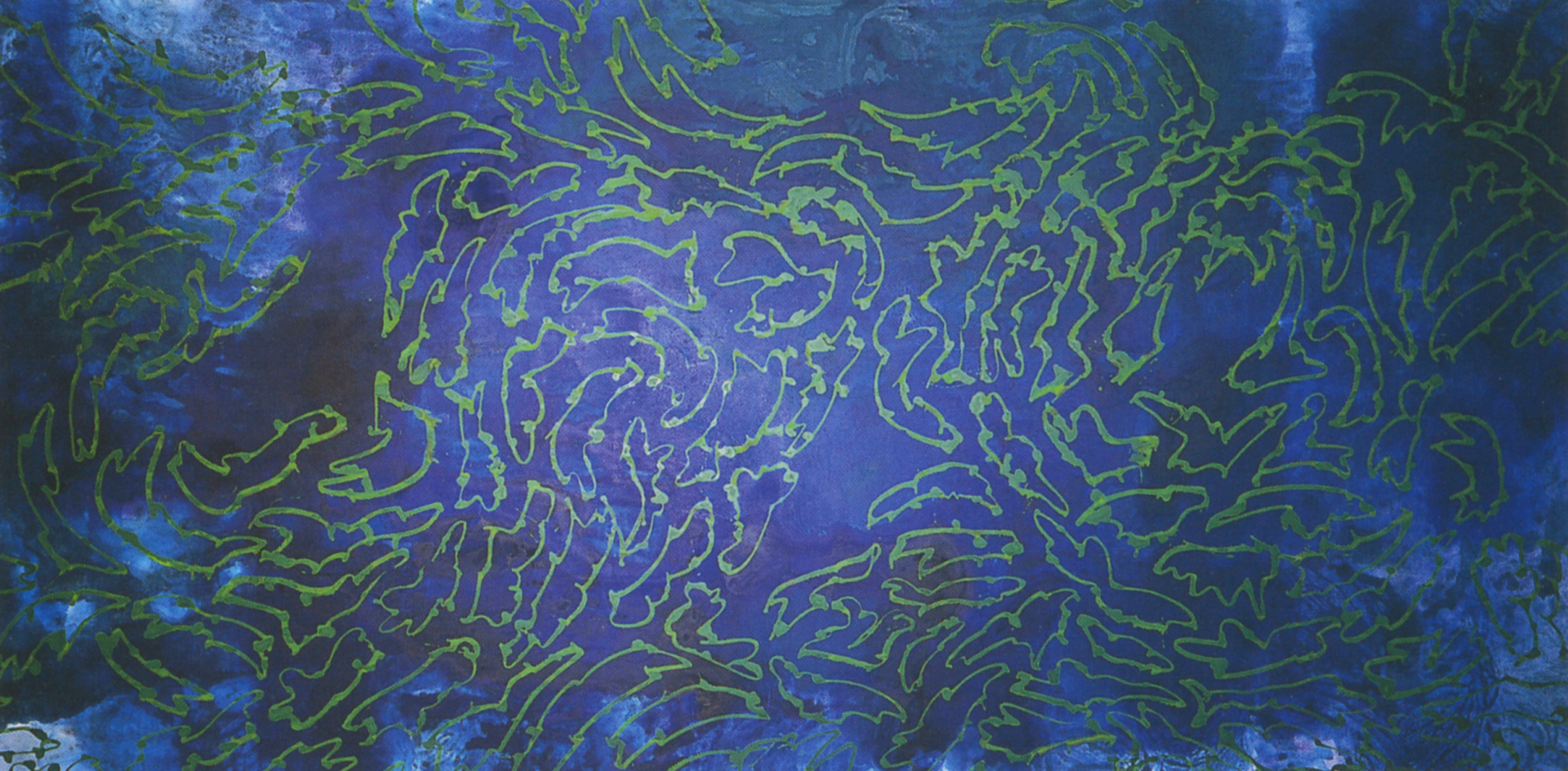 MOVING 16から一年後、93年の個展に出品しました。高いところから川を視つめていると刻々と変化する水の流れる形も不思議でありながら、素早く魚が泳いでいたり、静かに落葉が舞っていたり時には、サンショウオやカメが現れたりと自然界には、まだまだ私が経験したことにない世界が広がっているように感じました。そんな純粋な動きを手の中に記憶させて帰宅後一気に描き上げる、そんな日々に小さな喜びを感じることができるようになってきました。今まで動物の動きを捉えようと描き続けた経験や子供を見つめてきたことなどが全て集約されて完成しているように、物事の積み重ねが重層化されて絵画になっているということが理解できるようになりました。この頃、美術評論家や学芸員の方が個展会場に来られると私は、「自身の経験によって作品の奥行きや印象が変わる」という話を海外の作家の作品などと比較して話題にすると必ず、別の意見を熱く演説する目上の人が多く、実に活発なニューペーインティング全盛の時間でした。