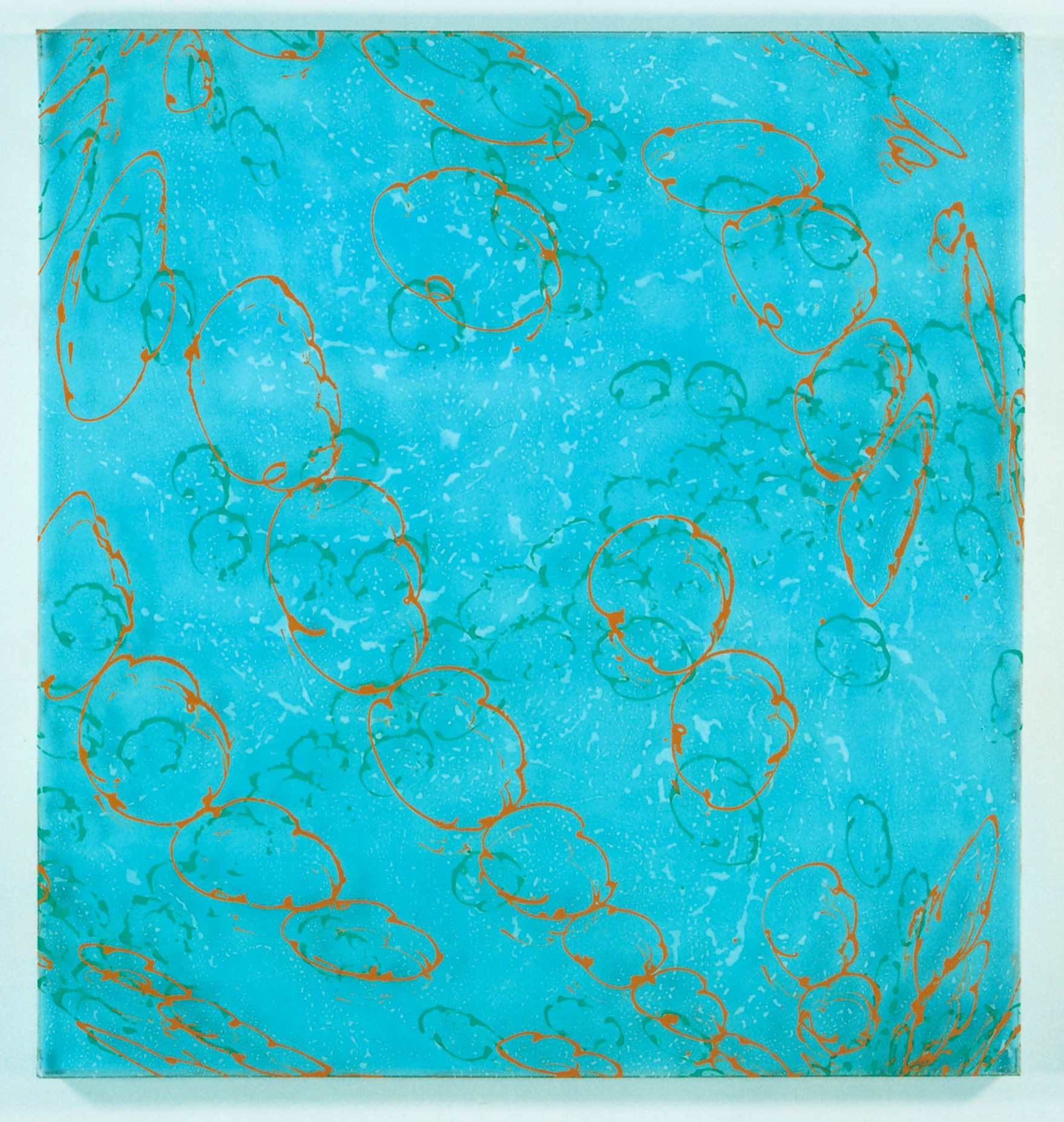 4角いクッションなのか、球体の一部なのか、どちらとも見える柔軟なテキスタイルのようなドローイングを繰り返していました。この微妙な色がなかなか写真で写すことが難しく、印刷原稿などにも使用しましたが、苦労しました。中に空気が入っていて厚み9センチなのですが、木枠とアクリル板とキャンバスとアセテートでできていて、いつも画廊内で約30分で組み立てて展示します。